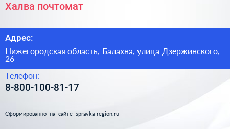 Халва, почтомат по адресу Нижегородская область, Балахна, улица Дзержинского, 26 в дальнейшем Организация, размещена в следующих категориях:
