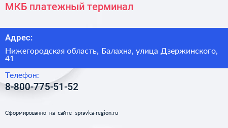МКБ, платежный терминал по адресу Нижегородская область, Балахна, улица Дзержинского, 41 в дальнейшем Организация, размещена в следующих категориях: