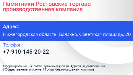 Памятники Ростовские, торгово-производственная компания по адресу Нижегородская область, Балахна, Советская площадь, 20 в дальнейшем Организация, размещена в следующих категориях: