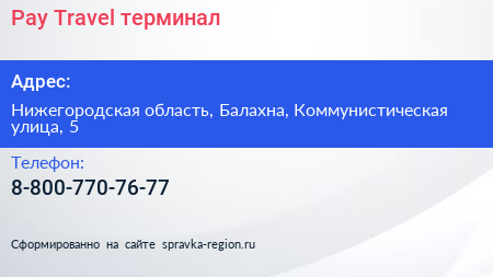 Pay.Travel, терминал по адресу Нижегородская область, Балахна, Коммунистическая улица, 5 в дальнейшем Организация, размещена в следующих категориях: