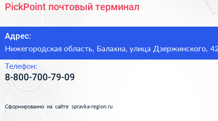 PickPoint, почтовый терминал по адресу Нижегородская область, Балахна, улица Дзержинского, 42 в дальнейшем Организация, размещена в следующих категориях: