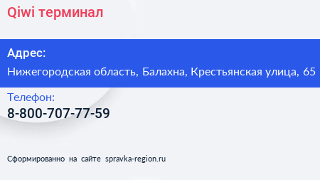 Qiwi, терминал по адресу Нижегородская область, Балахна, Крестьянская улица, 65 в дальнейшем Организация, размещена в следующих категориях: