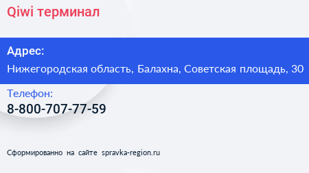 Qiwi, терминал по адресу Нижегородская область, Балахна, Советская площадь, 30 в дальнейшем Организация, размещена в следующих категориях: