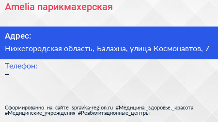 Amelia, парикмахерская по адресу Нижегородская область, Балахна, улица Космонавтов, 7 в дальнейшем Организация, размещена в следующих категориях: