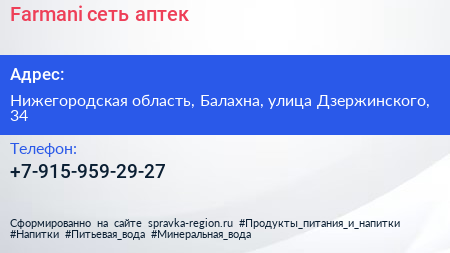 Farmani, сеть аптек по адресу Нижегородская область, Балахна, улица Дзержинского, 34 в дальнейшем Организация, размещена в следующих категориях:
