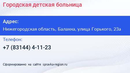Городская детская больница по адресу Нижегородская область, Балахна, улица Горького, 23а в дальнейшем Организация, размещена в следующих категориях: