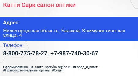 Катти Сарк, салон оптики по адресу Нижегородская область, Балахна, Коммунистическая улица, 4 в дальнейшем Организация, размещена в следующих категориях: