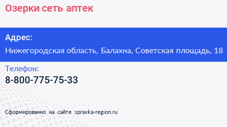 Озерки, сеть аптек по адресу Нижегородская область, Балахна, Советская площадь, 18 в дальнейшем Организация, размещена в следующих категориях:
