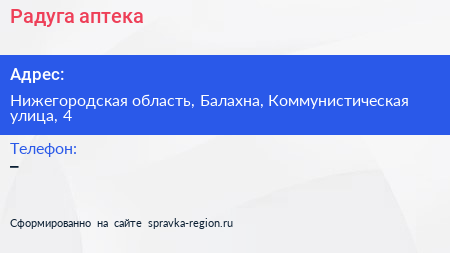 Радуга, аптека по адресу Нижегородская область, Балахна, Коммунистическая улица, 4 в дальнейшем Организация, размещена в следующих категориях: