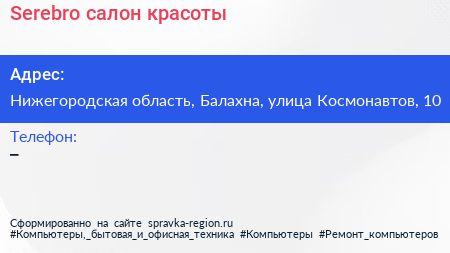 Serebro, салон красоты по адресу Нижегородская область, Балахна, улица Космонавтов, 10 в дальнейшем Организация, размещена в следующих категориях: