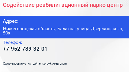 Содействие, реабилитационный нарко-центр по адресу Нижегородская область, Балахна, улица Дзержинского, 50а в дальнейшем Организация, размещена в следующих категориях: