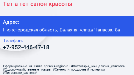 Тет-а-тет, салон красоты по адресу Нижегородская область, Балахна, улица Чапаева, 8а в дальнейшем Организация, размещена в следующих категориях: