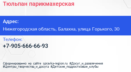 Тюльпан, парикмахерская по адресу Нижегородская область, Балахна, улица Горького, 30 в дальнейшем Организация, размещена в следующих категориях: