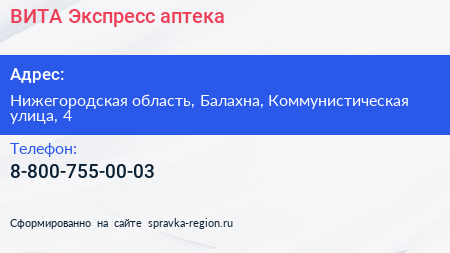 ВИТА Экспресс, аптека по адресу Нижегородская область, Балахна, Коммунистическая улица, 4 в дальнейшем Организация, размещена в следующих категориях: