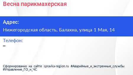 Весна, парикмахерская по адресу Нижегородская область, Балахна, улица 1 Мая, 14 в дальнейшем Организация, размещена в следующих категориях: