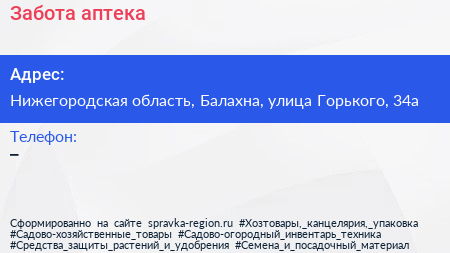 Забота, аптека по адресу Нижегородская область, Балахна, улица Горького, 34а в дальнейшем Организация, размещена в следующих категориях: