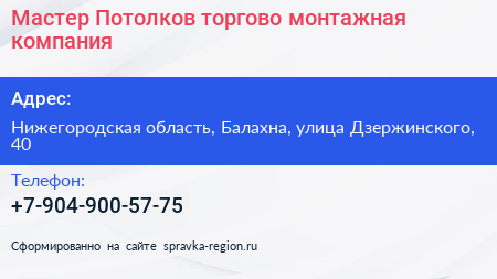 Мастер Потолков, торгово-монтажная компания по адресу Нижегородская область, Балахна, улица Дзержинского, 40 в дальнейшем Организация, размещена в следующих категориях: