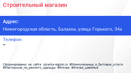 Строительный магазин по адресу Нижегородская область, Балахна, улица Горького, 34а в дальнейшем Организация, размещена в следующих категориях: