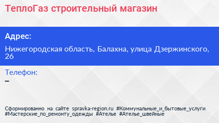 ТеплоГаз, строительный магазин по адресу Нижегородская область, Балахна, улица Дзержинского, 26 в дальнейшем Организация, размещена в следующих категориях: