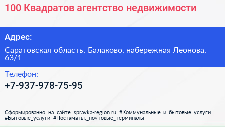 100 Квадратов, агентство недвижимости по адресу Саратовская область, Балаково, набережная Леонова, 63/1 в дальнейшем Организация, размещена в следующих категориях: