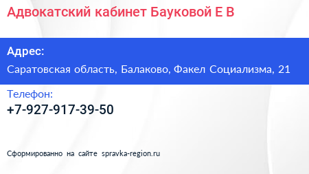 Адвокатский кабинет Бауковой Е.В. по адресу Саратовская область, Балаково, Факел Социализма, 21 в дальнейшем Организация, размещена в следующих категориях: