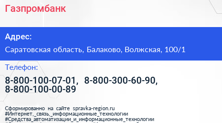 Газпромбанк по адресу Саратовская область, Балаково, Волжская, 100/1 в дальнейшем Организация, размещена в следующих категориях: