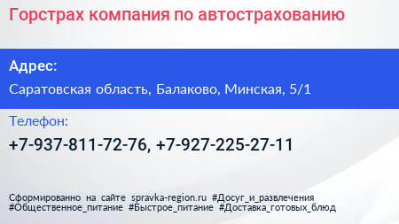 Горстрах, компания по автострахованию по адресу Саратовская область, Балаково, Минская, 5/1 в дальнейшем Организация, размещена в следующих категориях: