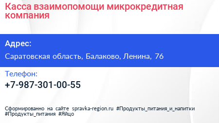 Касса взаимопомощи, микрокредитная компания по адресу Саратовская область, Балаково, Ленина, 76 в дальнейшем Организация, размещена в следующих категориях: