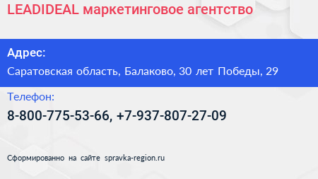 LEADIDEAL, маркетинговое агентство по адресу Саратовская область, Балаково, 30 лет Победы, 29 в дальнейшем Организация, размещена в следующих категориях: