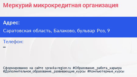 Меркурий, микрокредитная организация по адресу Саратовская область, Балаково, бульвар Роз, 9 в дальнейшем Организация, размещена в следующих категориях: