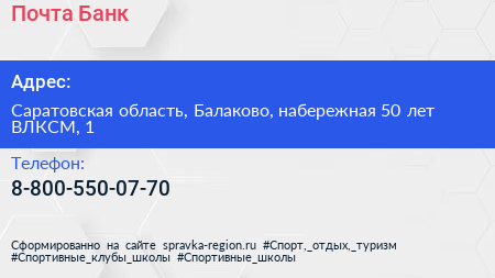 Почта Банк по адресу Саратовская область, Балаково, набережная 50 лет ВЛКСМ, 1 в дальнейшем Организация, размещена в следующих категориях: