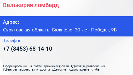 Валькирия, ломбард по адресу Саратовская область, Балаково, 30 лет Победы, 9Б в дальнейшем Организация, размещена в следующих категориях: