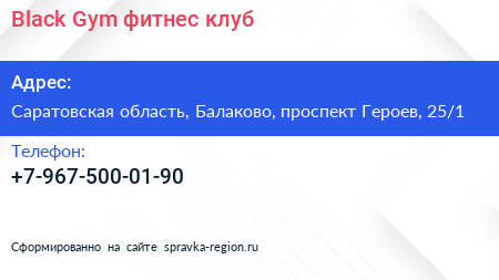 Black Gym, фитнес-клуб по адресу Саратовская область, Балаково, проспект Героев, 25/1 в дальнейшем Организация, размещена в следующих категориях: