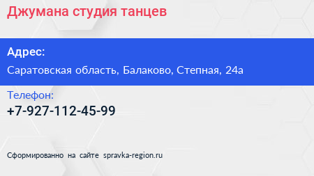Джумана, студия танцев по адресу Саратовская область, Балаково, Степная, 24а в дальнейшем Организация, размещена в следующих категориях: