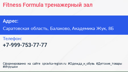 Fitness Formula, тренажерный зал по адресу Саратовская область, Балаково, Академика Жук, 8Б в дальнейшем Организация, размещена в следующих категориях: