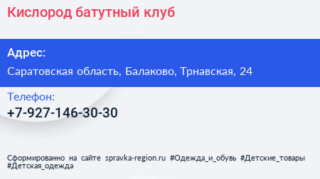 Кислород, батутный клуб по адресу Саратовская область, Балаково, Трнавская, 24 в дальнейшем Организация, размещена в следующих категориях: