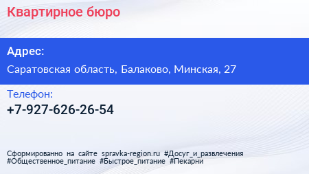 Квартирное бюро по адресу Саратовская область, Балаково, Минская, 27 в дальнейшем Организация, размещена в следующих категориях: