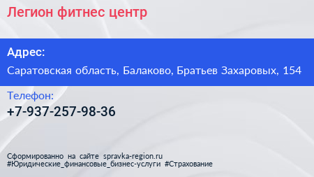 Легион, фитнес-центр по адресу Саратовская область, Балаково, Братьев Захаровых, 154 в дальнейшем Организация, размещена в следующих категориях: