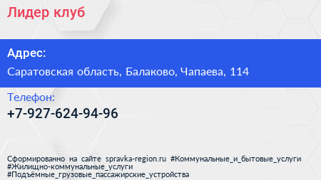 Лидер, клуб по адресу Саратовская область, Балаково, Чапаева, 114 в дальнейшем Организация, размещена в следующих категориях: