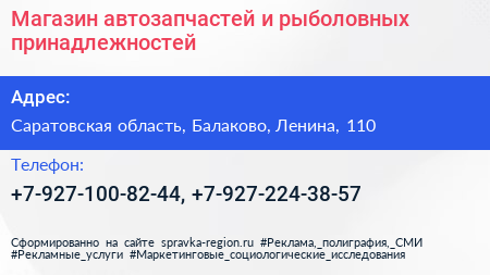 Магазин автозапчастей и рыболовных принадлежностей по адресу Саратовская область, Балаково, Ленина, 110 в дальнейшем Организация, размещена в следующих категориях: