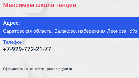 Максимум, школа танцев по адресу Саратовская область, Балаково, набережная Леонова, 69а в дальнейшем Организация, размещена в следующих категориях: