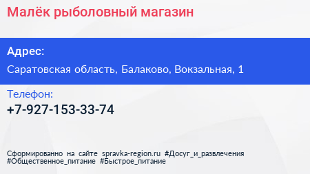 Малёк, рыболовный магазин по адресу Саратовская область, Балаково, Вокзальная, 1 в дальнейшем Организация, размещена в следующих категориях: