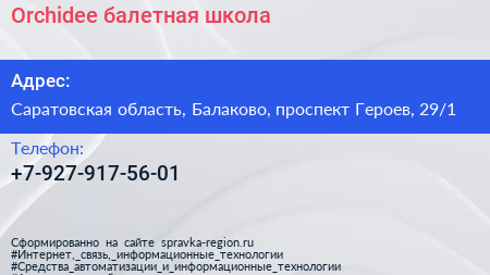 Orchidee, балетная школа по адресу Саратовская область, Балаково, проспект Героев, 29/1 в дальнейшем Организация, размещена в следующих категориях: