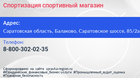 Спортизация, спортивный магазин по адресу Саратовская область, Балаково, Саратовское шоссе, 85/2а в дальнейшем Организация, размещена в следующих категориях: