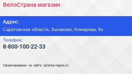 ВелоСтрана, магазин по адресу Саратовская область, Балаково, Комарова, 9а в дальнейшем Организация, размещена в следующих категориях: