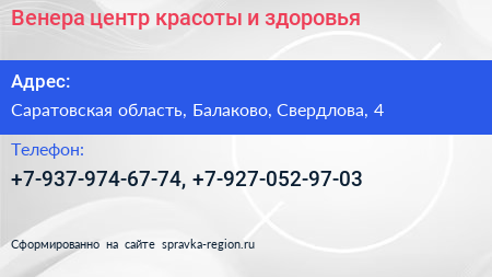 Венера, центр красоты и здоровья по адресу Саратовская область, Балаково, Свердлова, 4 в дальнейшем Организация, размещена в следующих категориях: