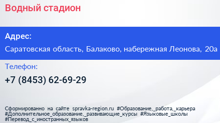 Водный стадион по адресу Саратовская область, Балаково, набережная Леонова, 20а в дальнейшем Организация, размещена в следующих категориях: