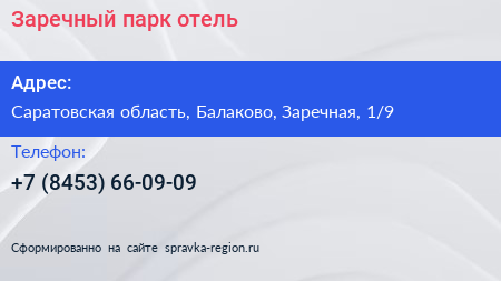 Заречный, парк-отель по адресу Саратовская область, Балаково, Заречная, 1/9 в дальнейшем Организация, размещена в следующих категориях: