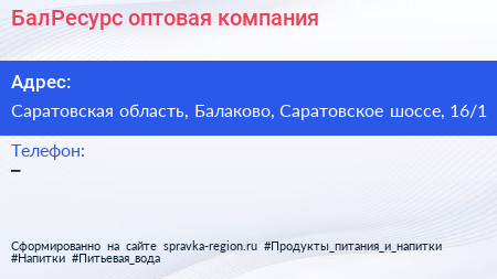 БалРесурс, оптовая компания по адресу Саратовская область, Балаково, Саратовское шоссе, 16/1 в дальнейшем Организация, размещена в следующих категориях: