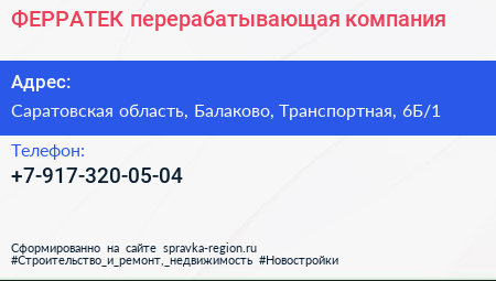 ФЕРРАТЕК, перерабатывающая компания по адресу Саратовская область, Балаково, Транспортная, 6Б/1 в дальнейшем Организация, размещена в следующих категориях: